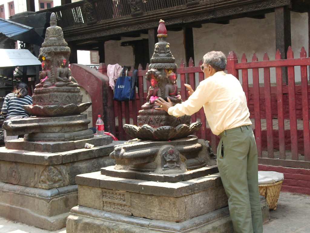 ネパールのカトマンズでストゥーパに礼拝をしている人の写真。